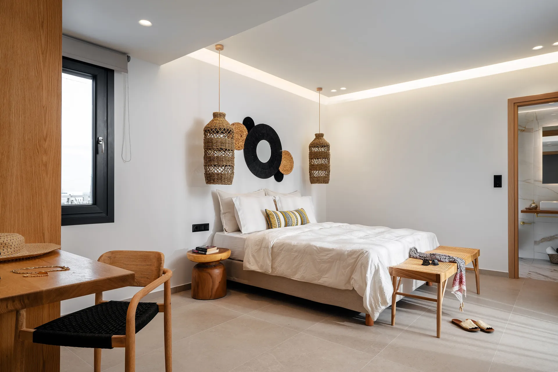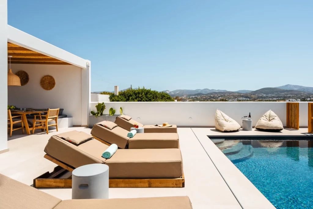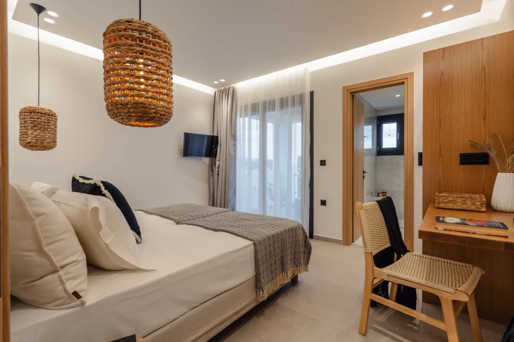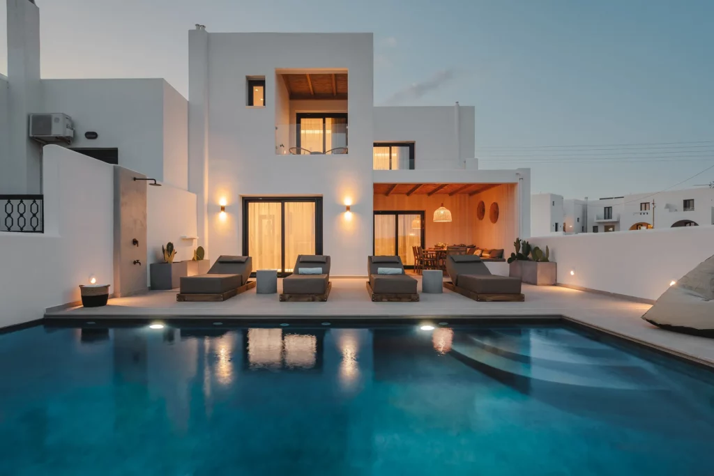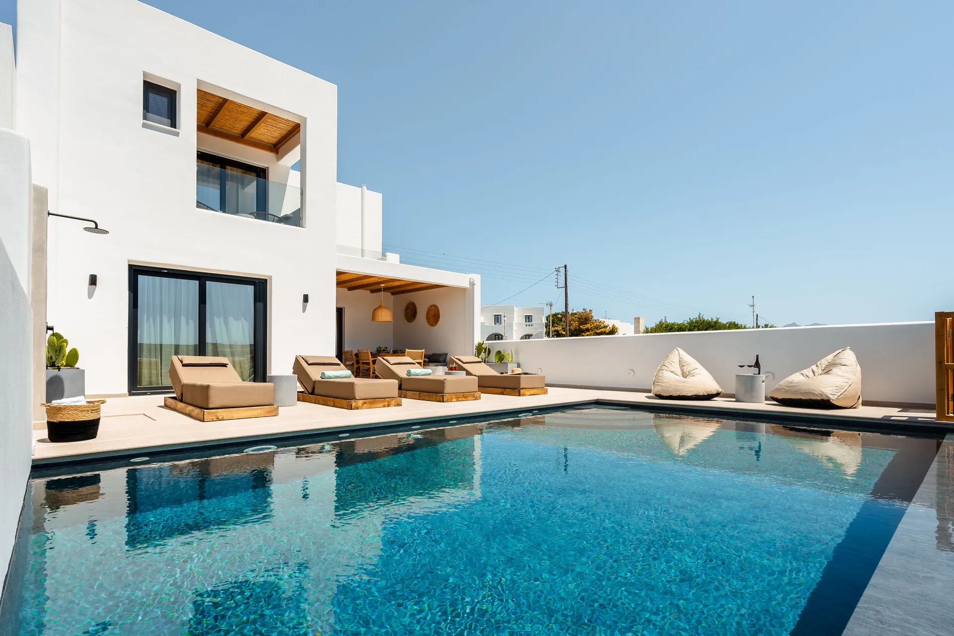 Agia Anna Luxury Villa is a high-end retreat designed in harmony with its natural surroundings. It offers three double bedrooms, each with its own en-suite bathroom, and features a spacious outdoor patio with a wooden pergola, built-in sofa, air conditioning, and a private outdoor pool. Both the pool area and our balconies provide breathtaking views that blend the mountains with the sea.