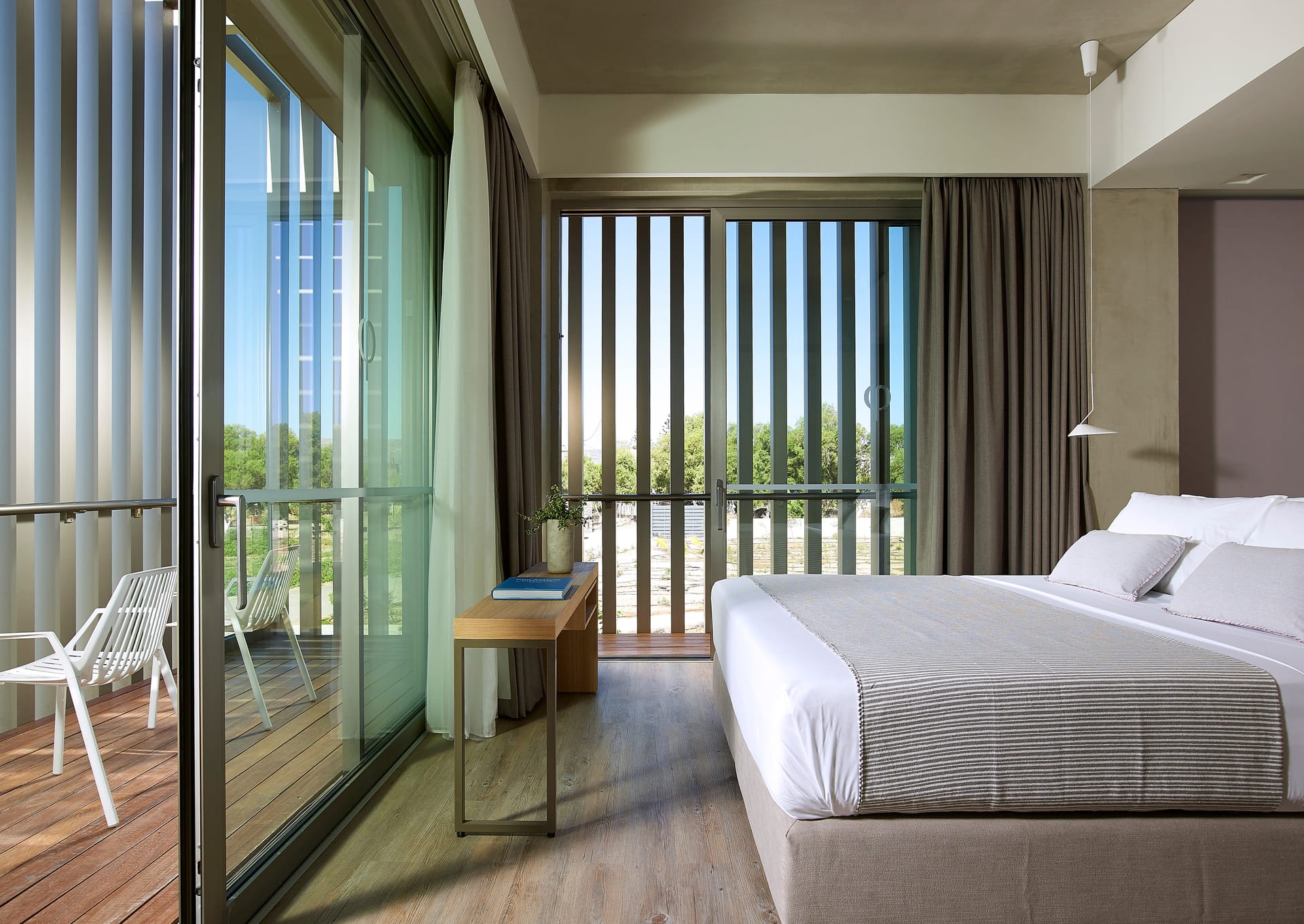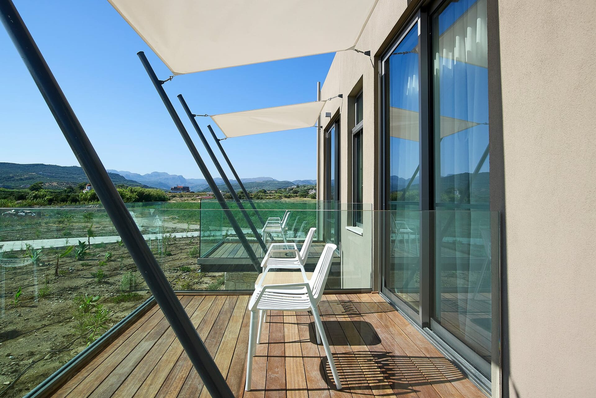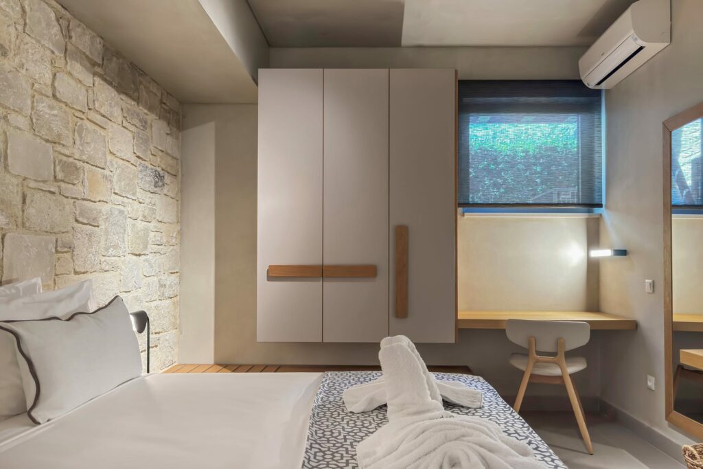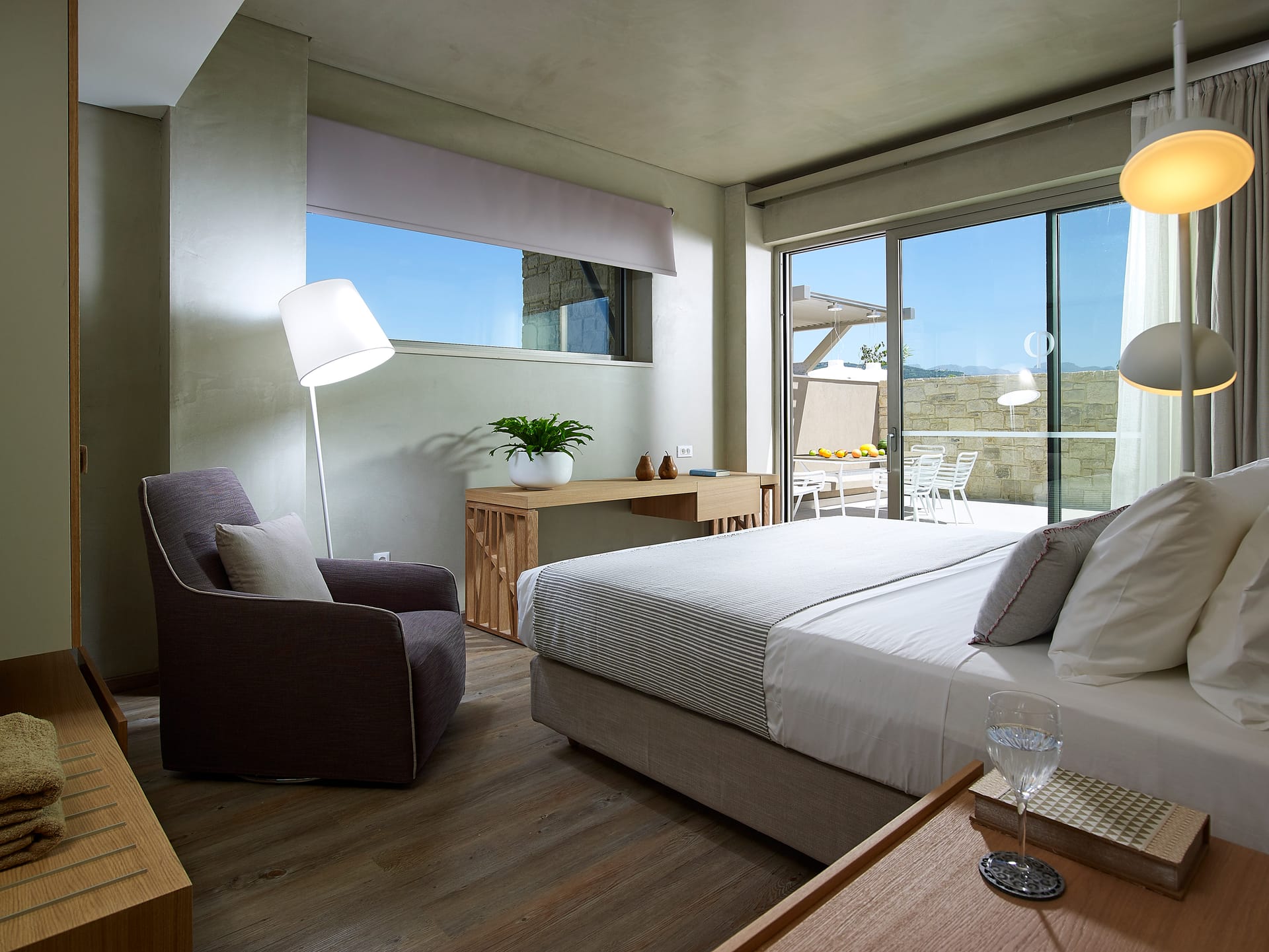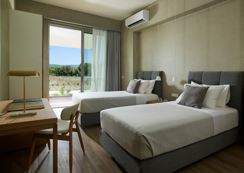 Kissamos Beach Estate offers multiple bedrooms, each thoughtfully designed for refined holiday living and furnished to an exceptional standard. Every bedroom features COCO-Mat premium bedding and furnishings crafted from natural, raw materials, ensuring outstanding comfort and a truly restful stay.