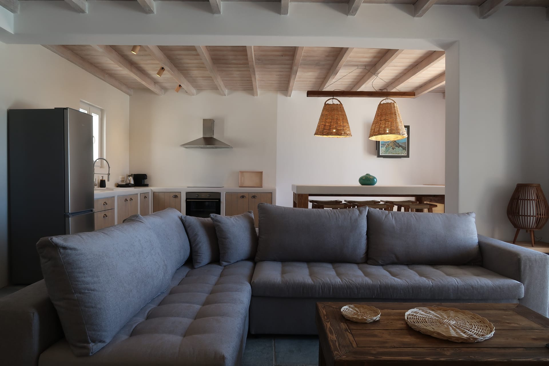 Blending timeless Cycladic allure with contemporary comfort, each villa features spacious living areas, refined minimalist interiors, and tranquil countryside views that create an atmosphere of pure relaxation and privacy. Thoughtfully designed for both style and ease, the villa offers generous indoor–outdoor living, allowing guests to unwind in a peaceful setting just moments from the island’s highlights.
