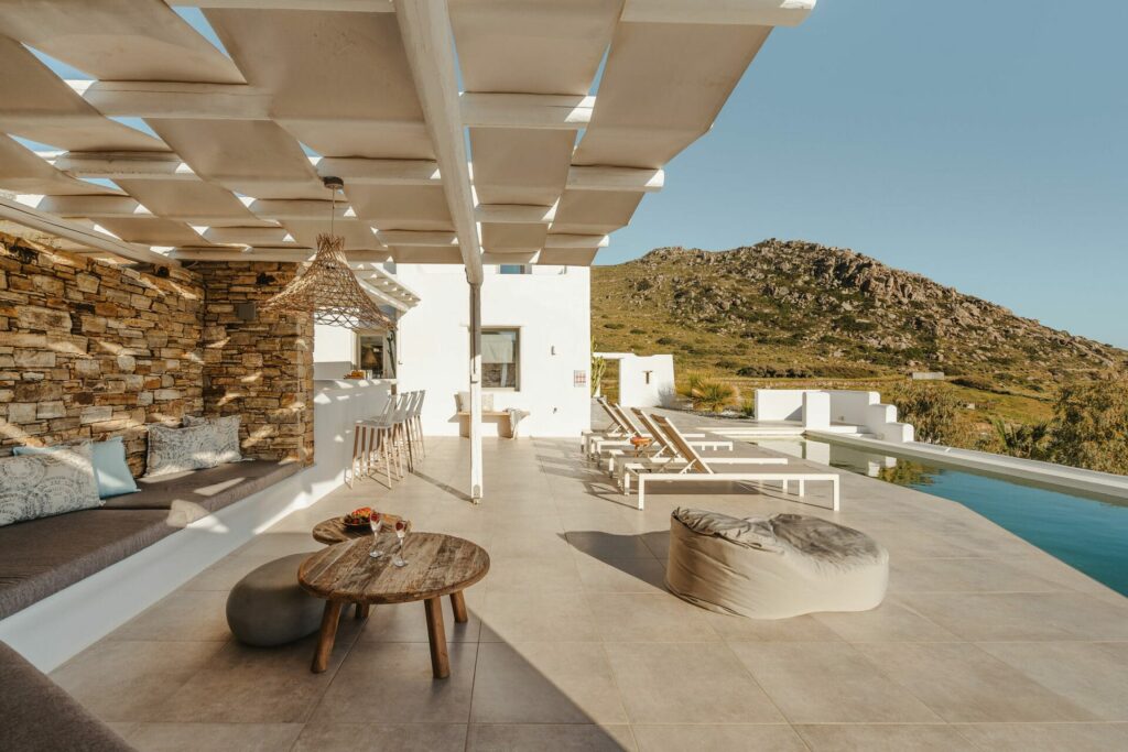 Step outside onto a large terrace with a covered dining area with BBQ, private swimming pool, and sun loungers for relaxation.
