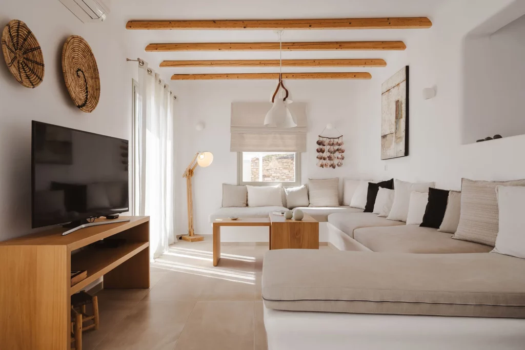 Showcasing a luminous Cycladic design, the villa has been carefully crafted to deliver both refined elegance and complete comfort. Spread across two independent levels, it offers four en-suite bedrooms, each with direct access to the outdoors and captivating sea views. Inside, contemporary styling is softened by crisp white hues and warm, earthy accents, creating an inviting and sophisticated ambience throughout.