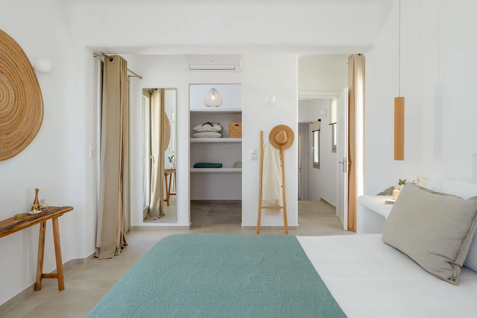 Double bedroom with a queen-size bed, bathroom, and balcony with sea view.