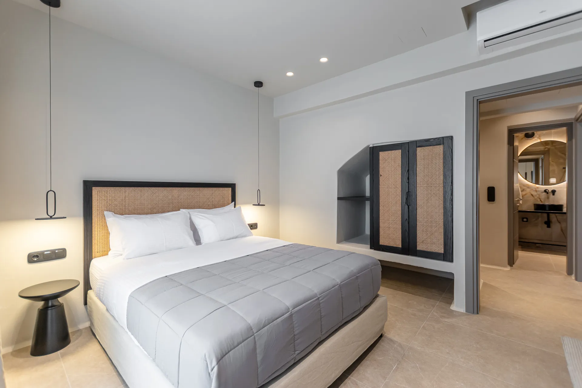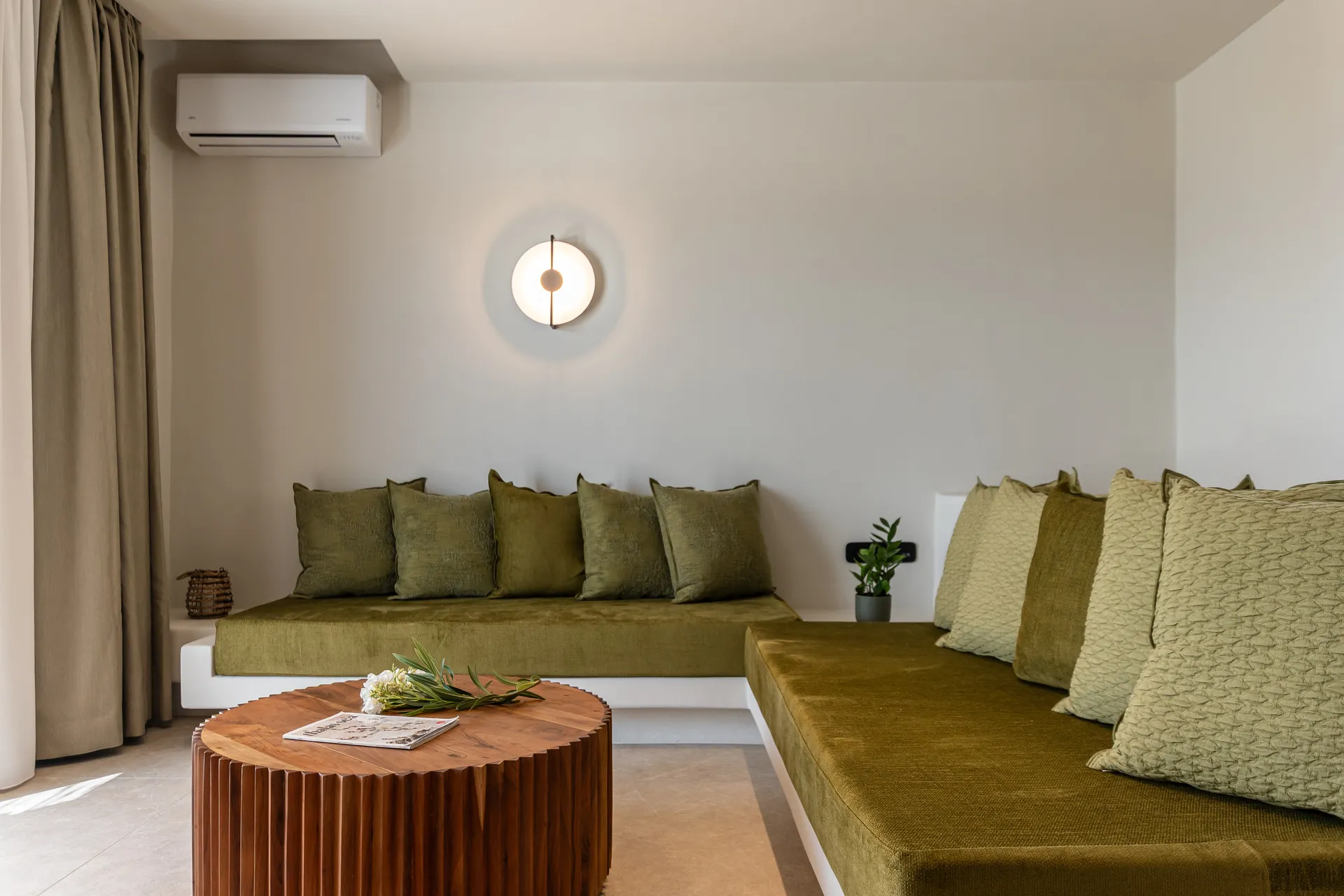 Outside, you’ll find a private pool, sun loungers, and a shaded dining area perfect for relaxing or enjoying meals outdoors. With Cycladic design and modern amenities, the villa offers a balance of island style and convenience.