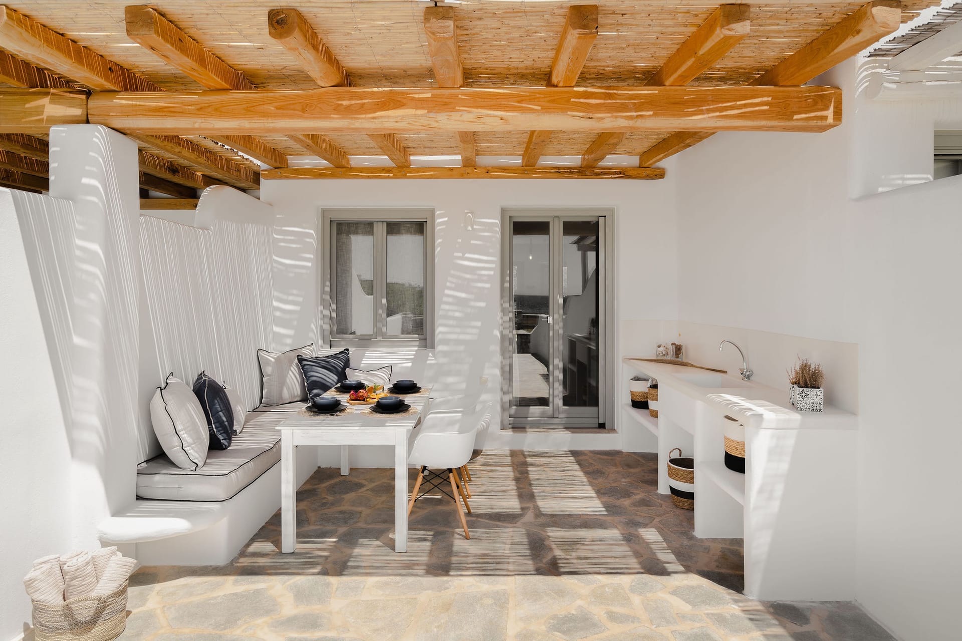The outside terrace has a private pool, covered dining area, and sun beds for relaxation.