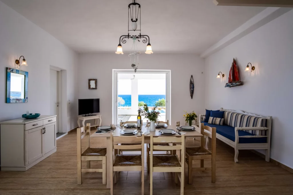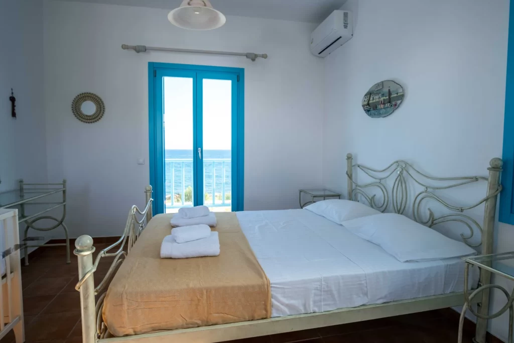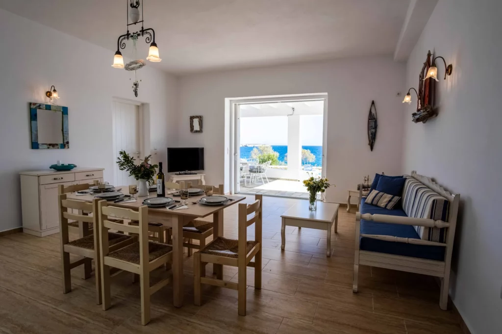 On the main floor, you’ll find a fully equipped kitchen, a spacious living room, and two bedrooms one with a double bed and one with three single beds along with a bathroom. This level opens onto a veranda with a dining table, offering views of the Aegean Sea, the pool, and the Mediterranean garden.
