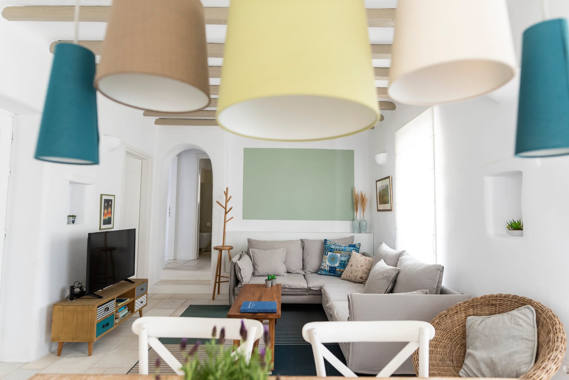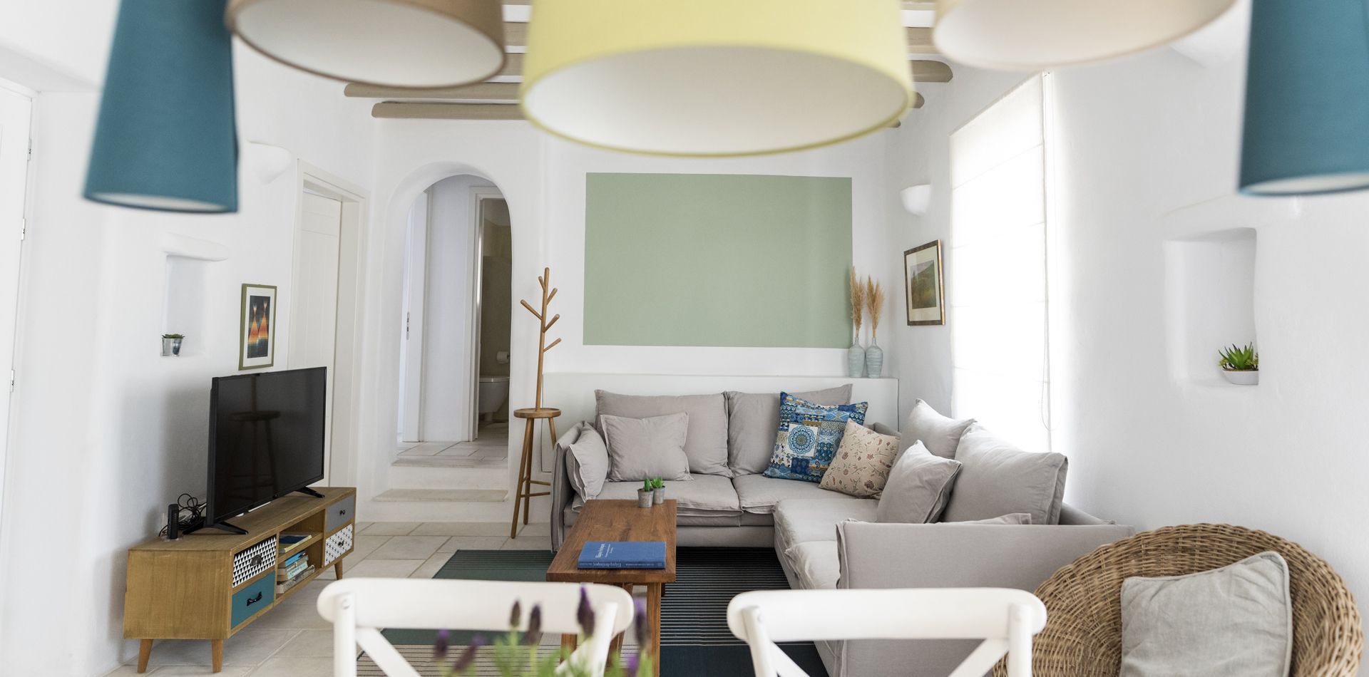 Bathroom with shower, beach towels, pool towels, hairdryer, closet/wardrobe, writing desk, sitting area, living room, sofa bed, flat-screen TV, television, free Wi-Fi internet access, individually controlled air conditioning, fully equipped kitchenette, kitchen, refrigerator, coffee-making facilities, dining table, private balcony or terrace, sea view and countryside views.