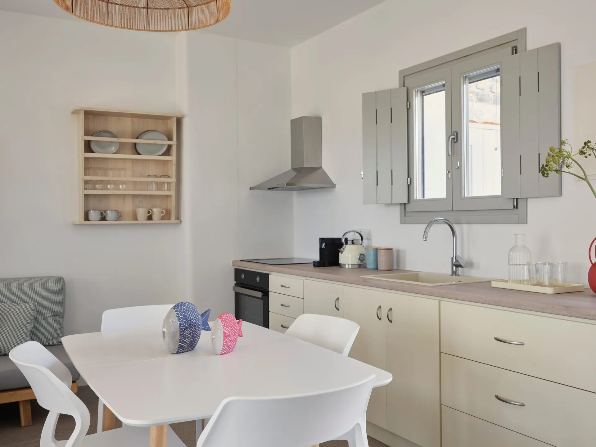 This ground-floor villa consists of two separate units. The main villa includes 2 double bedrooms, 1 bathroom, a living area, and a fully equipped kitchen, accommodating up to 5 guests.