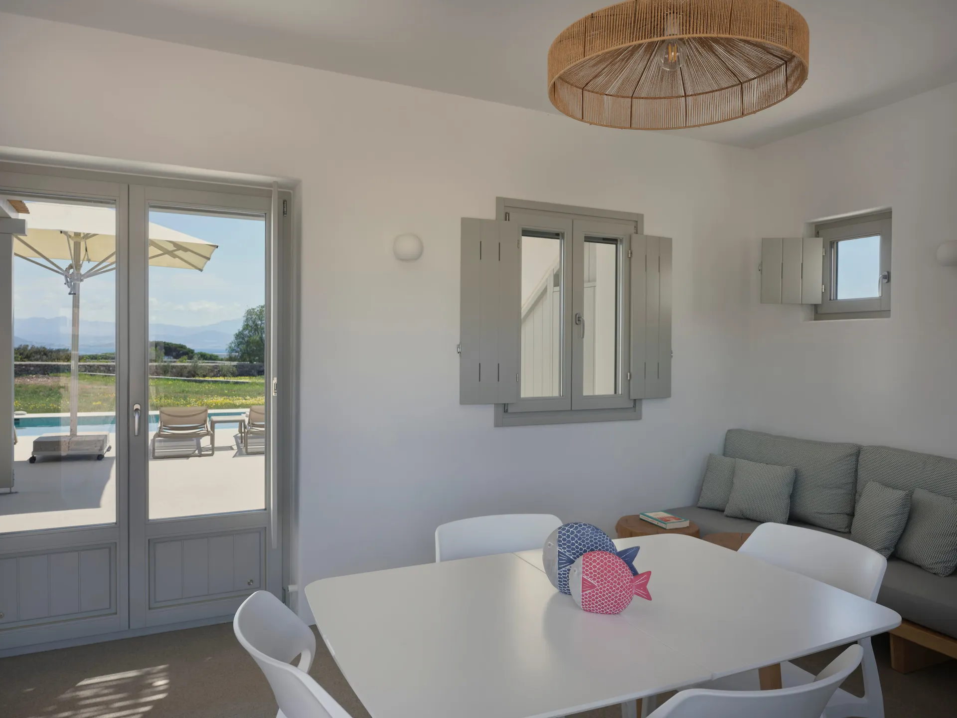 Outside, the villa opens onto a spacious terrace with a private pool, a dining area, and a comfortable lounge an ideal spot for relaxation.