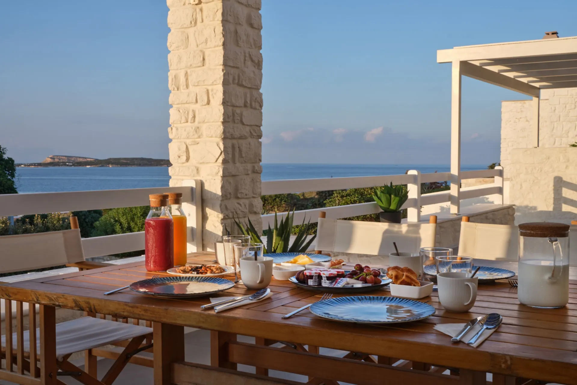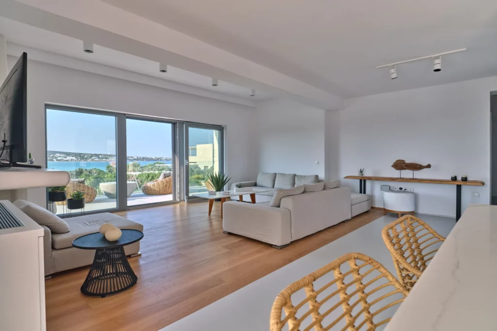 Villa Atheria is a stunning five-bedroom retreat set on a pristine plot surrounded by a landscape of natural beauty. Overlooking the sparkling Aegean Sea, the villa sits within lush gardens filled with trees, flowering paths, and tranquil corners.