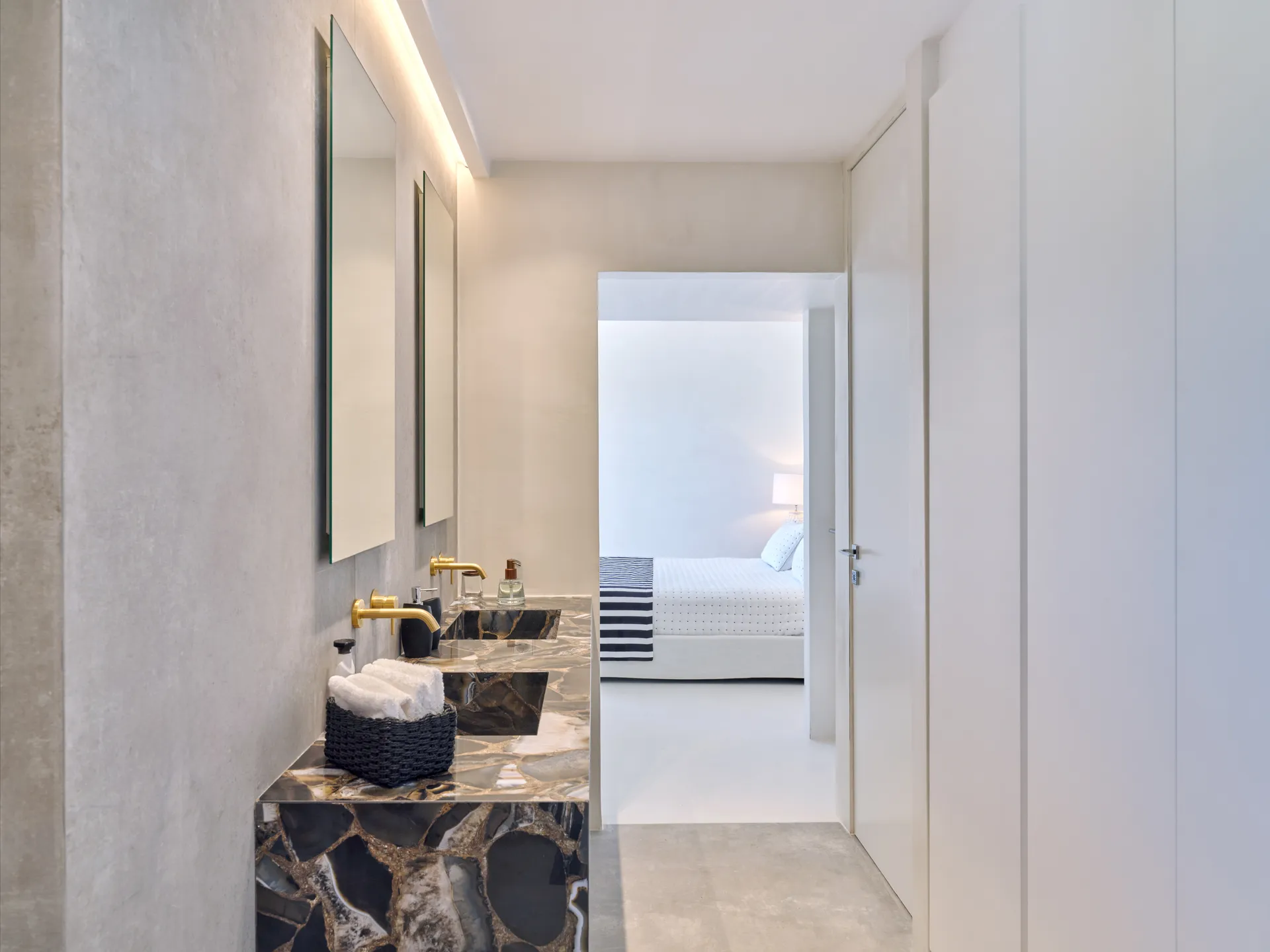 Grand Villa accommodates up to 12 guests in six elegant bedrooms across three levels of refined Cycladic design. Spanning 350 sqm, the villa combines timeless island charm with modern luxury.