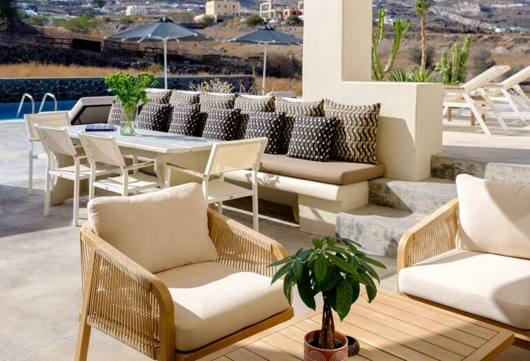 Recently built and finished to exceptionally high standards, the villa is set within a peaceful rural landscape of vineyards, yet enjoys a highly convenient location on the edge of Fira’s lively centre and just 1.7 km from the calm, well-organised beach of Exo Gialos. It is an ideal base from which to explore Santorini, with all major attractions just a short drive away.